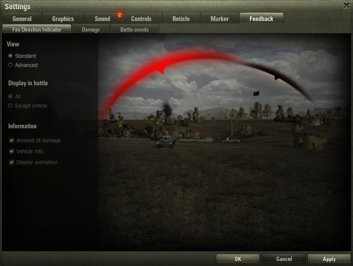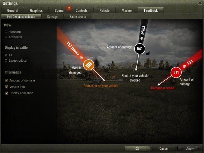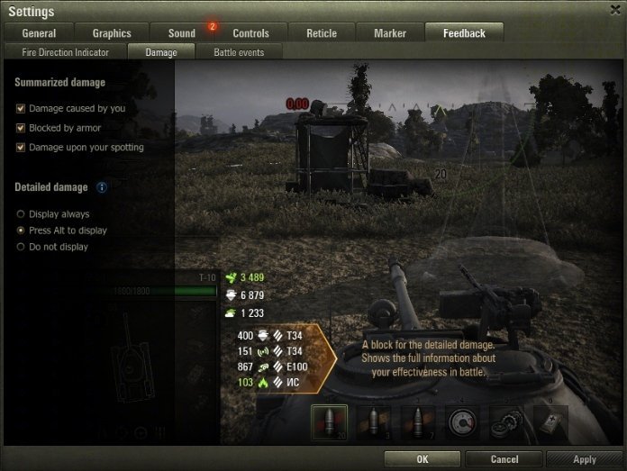 Zadane uszkodzenia, uszkodzenia zadane przy asyście gracza, zablokowane uszkodzenia, otrzymane uszkodzenia, wskaźnik kierunku ognia.