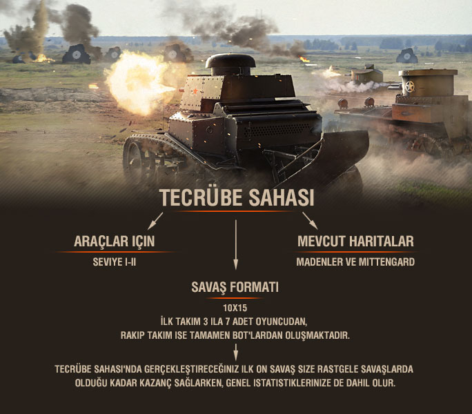 "Tecrübe Sahası" adında yeni bir PvE (player vs environment) Savaş Kipi 9.12 Güncellemesi ile kullanıma sunulacaktır. Bu, yeni tankçıların World of Tanks'daki ilk adımlarını atmalarına yardımcı olmak üzere bir PvE eğitim kipi olarak tasarlandı. Temel oyun mekanikleriyle tanışın ve kendinizi yapay zeka kontrollü bot'lara karşı yapacağınız savaşlarda kanıtlayın!