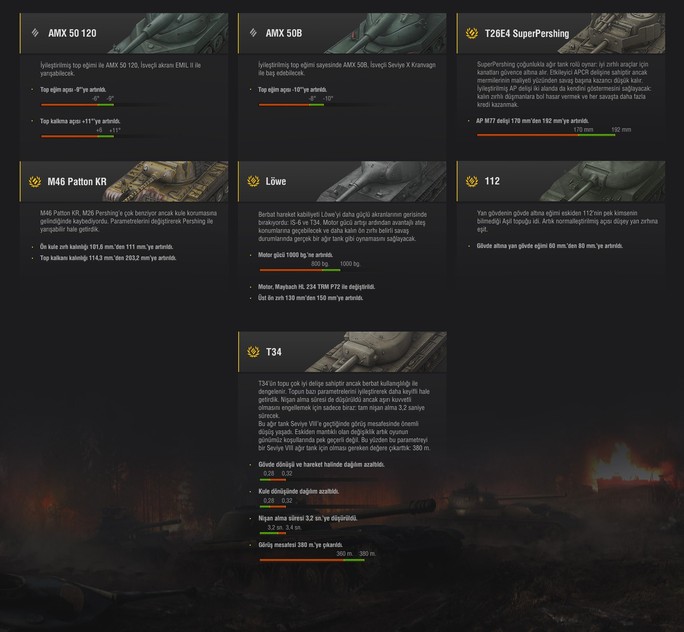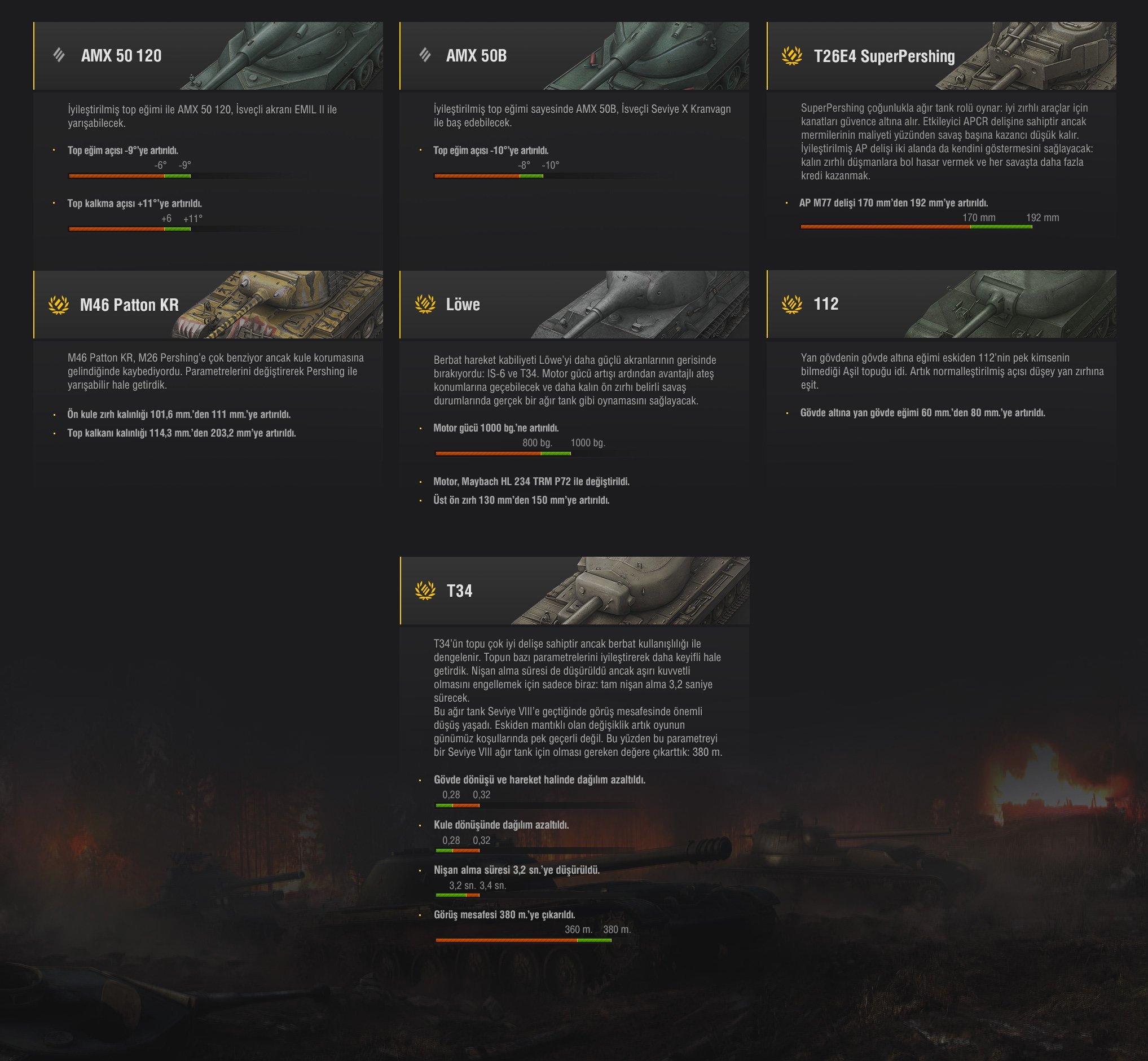 Löwe bir takviye daha aldı: daha güçlü bir motor ve daha kalın zırh. Ek olarak, geri bildiriminize dayanarak, 4 Premium aracın daha savaş parametrelerini iyileştirdik: Amerikan T34 ve T26E4 Super Pershing, M46 Patton KR, Çinli 112 ve iki Fransız ağır tank: АМХ 50В ve АМХ 50 120. Detaylı bilgiler için aşağıdaki görsele sol tıklayın: