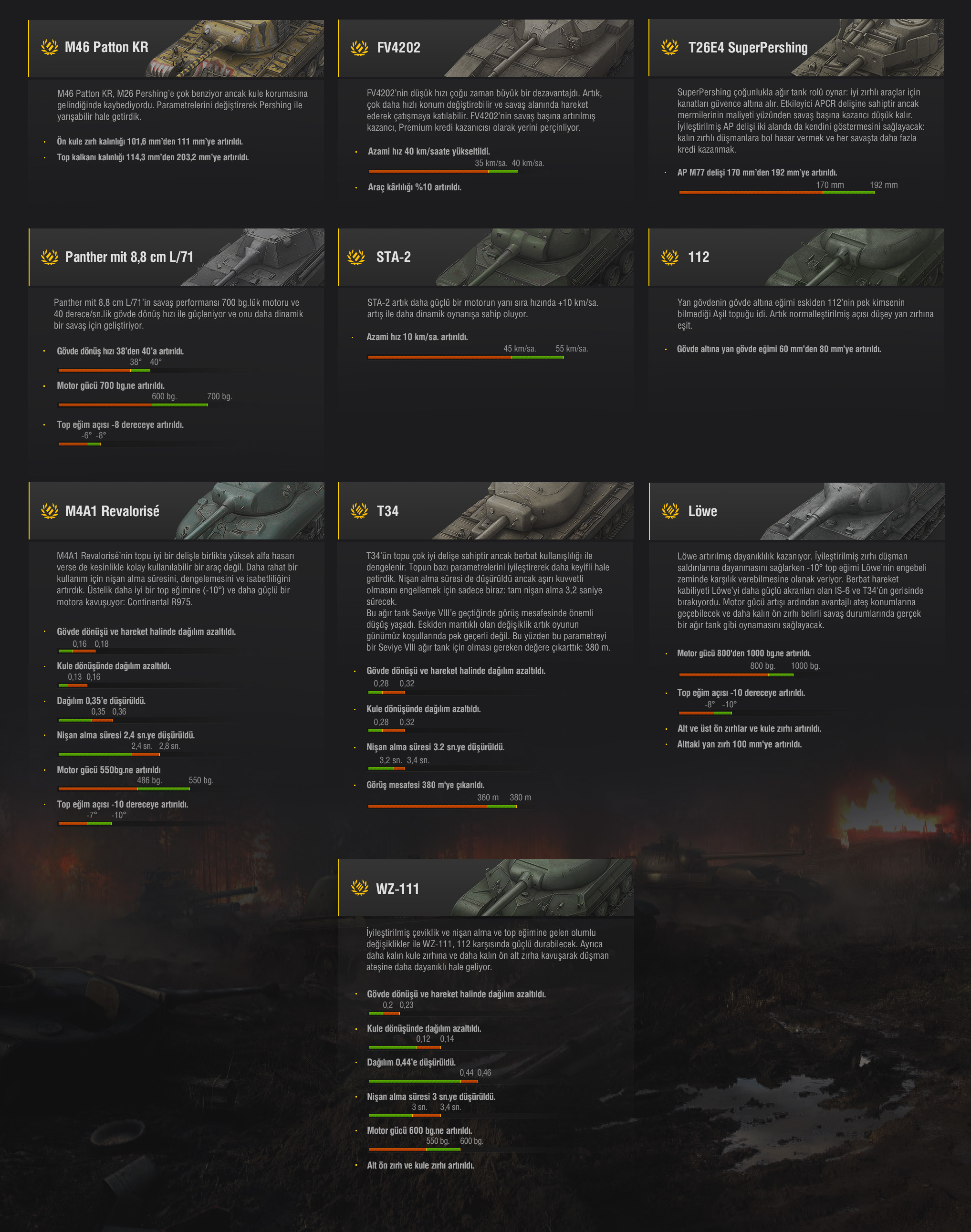 Geri bildirimleriniz sayesinde bazı Premium araçlar için ilk değişiklik turunun üzerine eğildik ve FV4202, STA-2, M4A1 Revalorisé, T26E4 SuperPershing, WZ-111, Löwe, Panther 8.8, T34, M46 Patton KR ve 112’nin savaş parametrelerini değiştirdik.