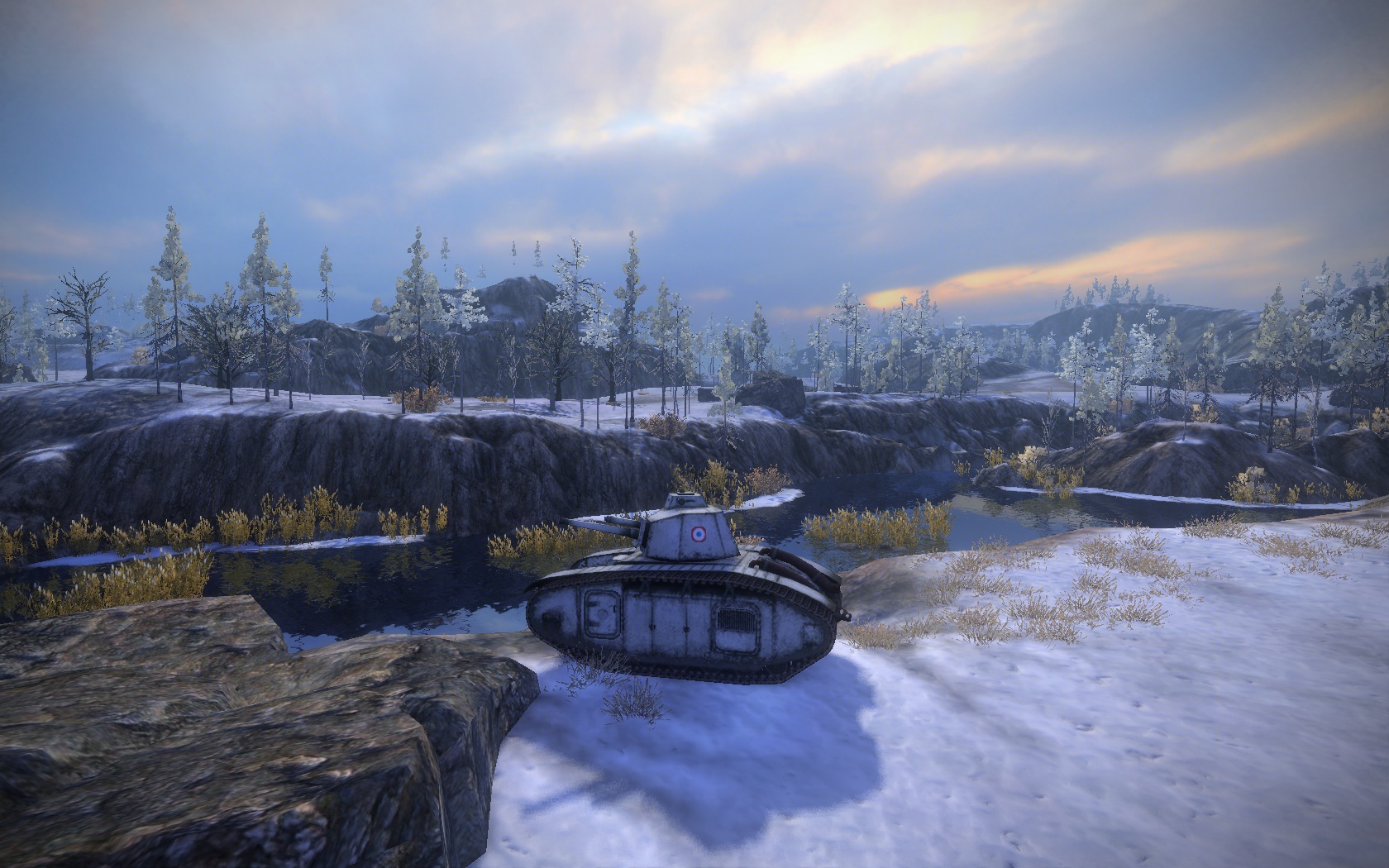 - Dle barvy oblohy a vody můžete usoudit, že se bude tank nacházet na mapě s chladným podnebím, bez budov.