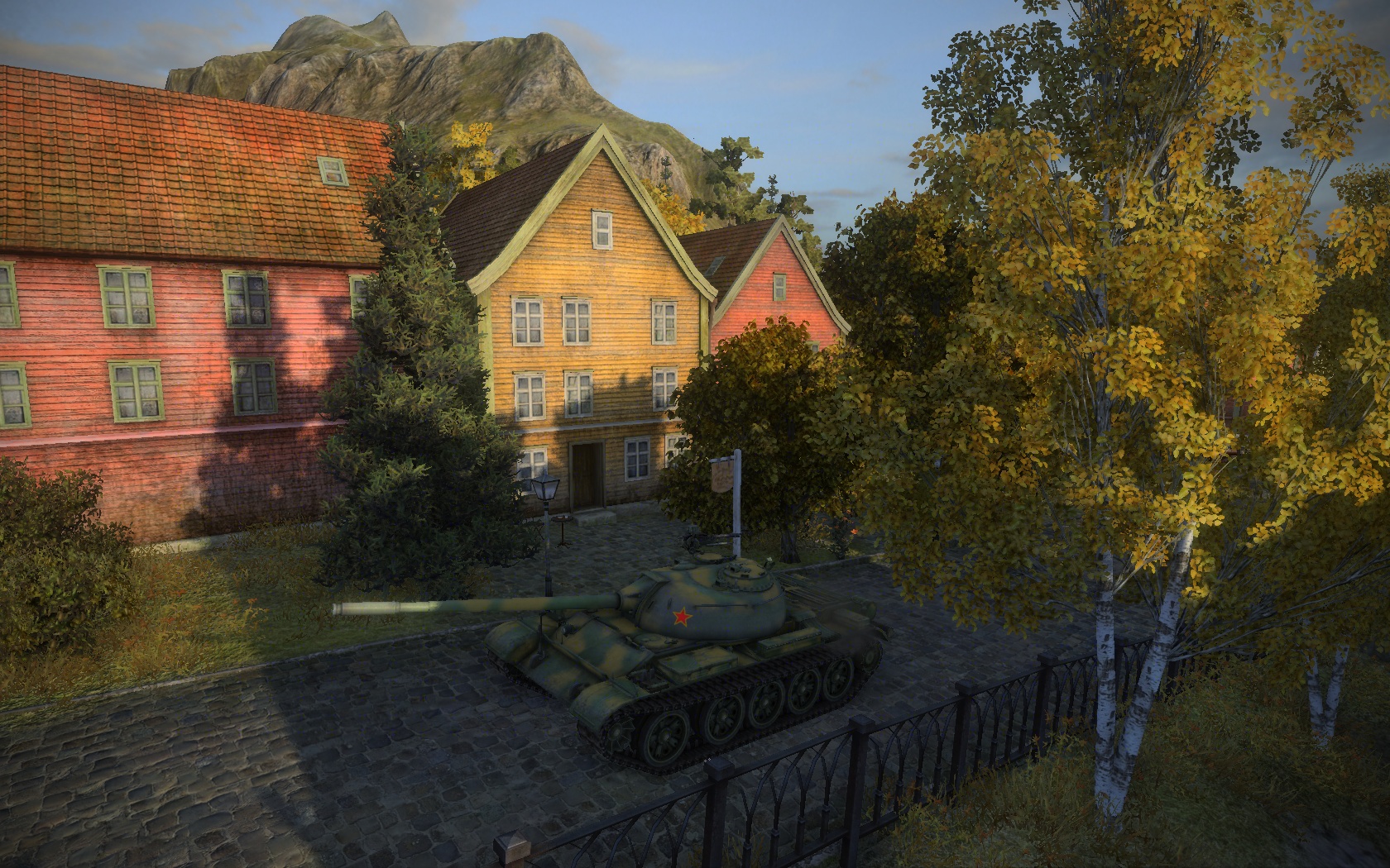 - Část cesty na které se tank nachází je obklopena stromy a v zátiší si můžete všimnout vrcholku hory. Postavení budov vám napoví přesnou pozici na mapě, což je G7.