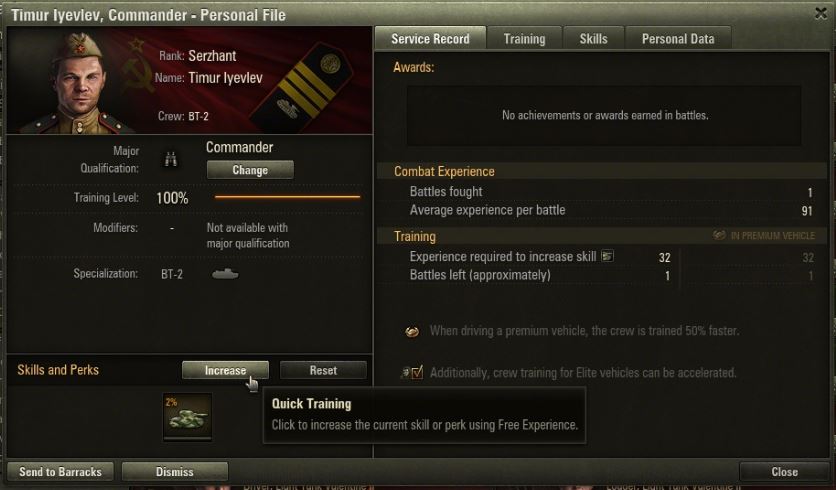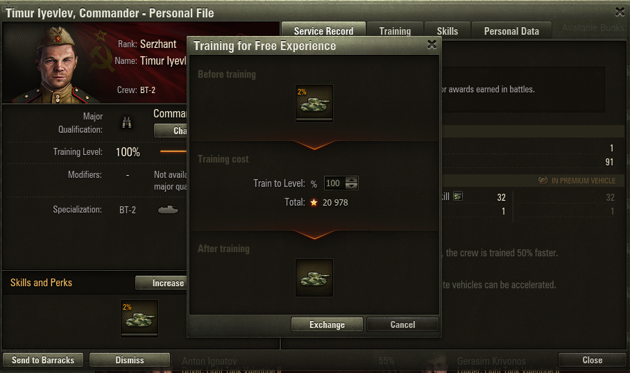 If you click on it, a special menu will pop up, in which you can determine the level of training you want to conduct using your Free XP for that particular tanker, and see how much of the Free XP the process will convert. After that, just click on the Exchange button and voila – your tanker’s skill/perk level is now increased:
