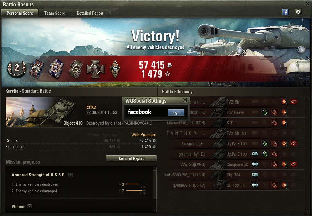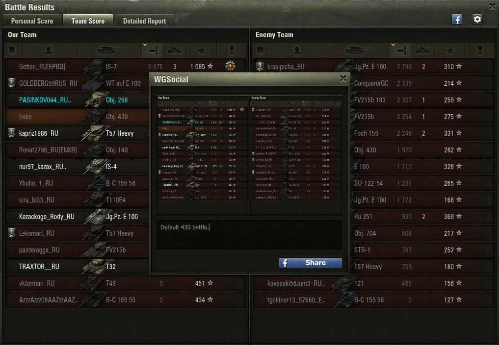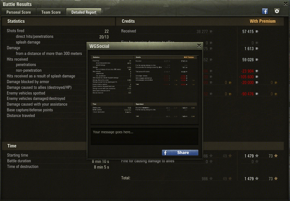 Avec la mise à jour 9.6, une nouvelle version du WG social mod est disponible. Il permet le partage de résultats de bataille sur Facebook directement depuis le client. Vous pouvez également partager les résultats de votre équipe ainsi que l'onglet Rapport détaillé en plus de votre score personnel.